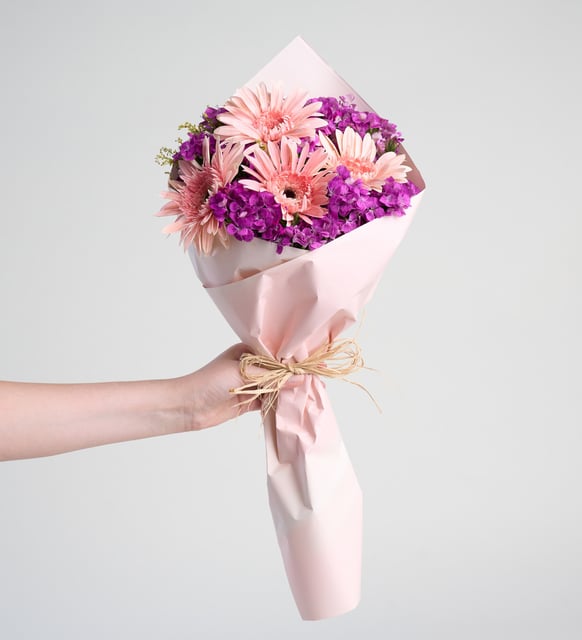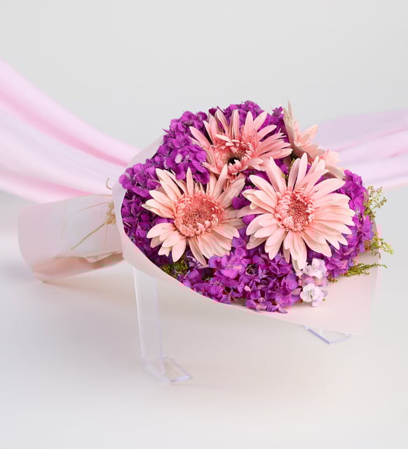 تألقي بأجمل لحظات الفرح مع هذه الباقة المشرقة التي تجمع بين زهور الجيربيرا الوردية الناعمة التي ترمز للبراءة والإيجابية، وبين الأزهار البنفسجية الزاهية التي تضيف لمسة من العمق والرقي. مزيج الألوان المتناغم يمنح إحساسًا بالبهجة والدفء، ليكون خيارًا مثاليًا للإهداء في كل مناسبة سعيدة.